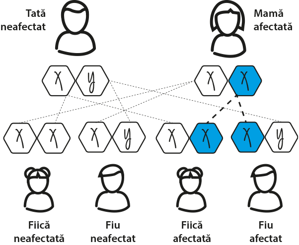 - Acest lucru se întâmplă deoarece mama are doi cromozomi X, și copiilor săi le-ar putea fi transmis fie cromozomul X cu mutația Fabry, fie cromozomul X fără mutația Fabry
