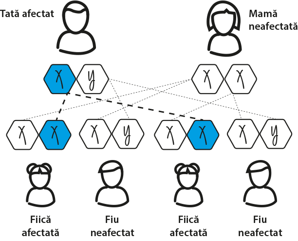 Un tată afectat de boala Fabry va transmite mutația Fabry către toate fiicele sale, însă către niciunul dintre fii:1