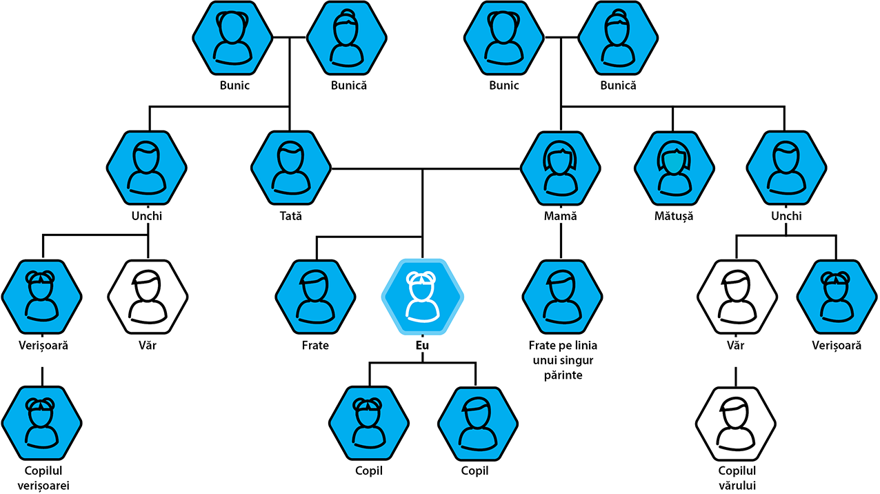 Persoanele evidențiate cu albastru ar putea prezenta mutația Fabry, dar în realitate, este improbabil ca toate să o prezinte efectiv. Deoarece boala Fabry este rară și, pentru manifestarea bolii, este necesară o singură mutație Fabry, este probabil să fie afectată, de exemplu, numai o latură a familiei dvs.