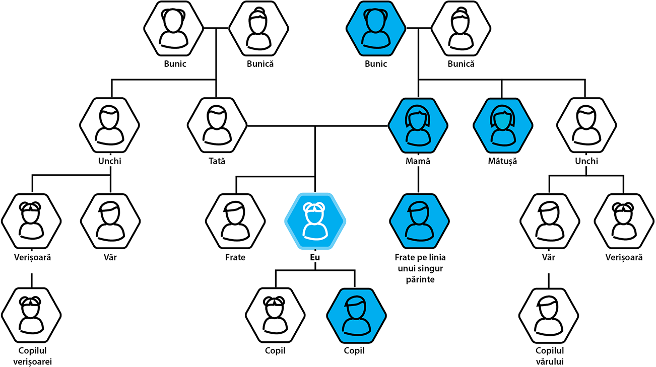 Iată aici un exemplu al modului în care boala Fabry poate fi transmisă descendenților de-a lungul generațiilor unei familii, începând de la bunicul matern.